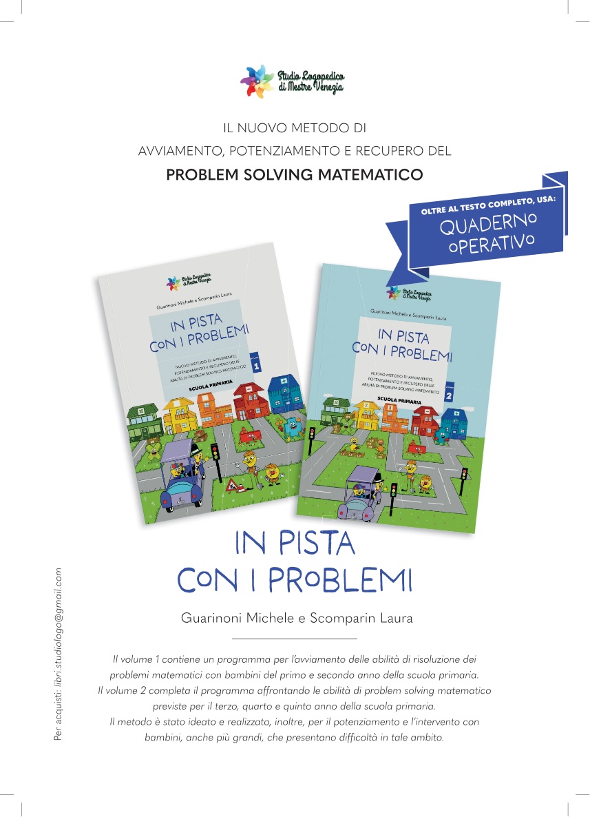 Gennaio 2025 Guarinoni Michele e Scomparin Laura "IN PISTA CON I PROBLEMI -VOLUME 2. Nuovo metodo di avviamento, potenziamento e recupero delle abilità di problem solving matematico”. Questo volume prosegue il programma del VOLUME 1 ed è pensato per bambini a partire dal terzo anno di scuola primaria, nonché per il potenziamento e l’intervento con bambini, anche più grandi, che presentano difficoltà specifiche in questi ambiti.